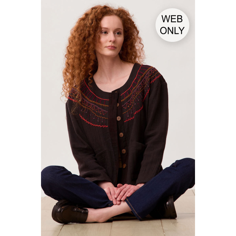 Hand embroidery in a classic Fair Isle pattern elevates this soft and comfy double-cloth top into the more-than-ordinary category. Add the upcycled Chindi Patchwork placket and embroidered back yoke, and this top tops it. Ready to wear alone or layered. While the dominant color is black, Chindi patchwork colors and patterns may vary due to the variety of upcycled fabrics. Generously cut - consider sizing down for a less oversized look.