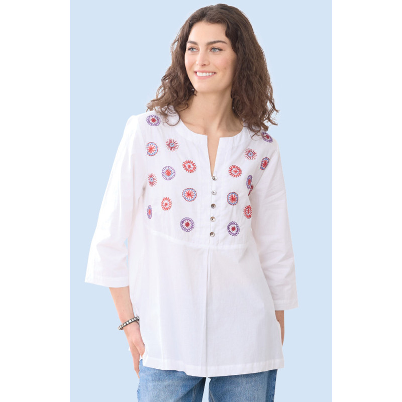 This simple eco-friendly A-line top is elevated by the red and blue hand embroidery artistry on the soft shirting-weight organic cotton. Notch-neck and button-and-loop placket, curved seam, and center pleat make this shirt special. Three-quarter length sleeves.