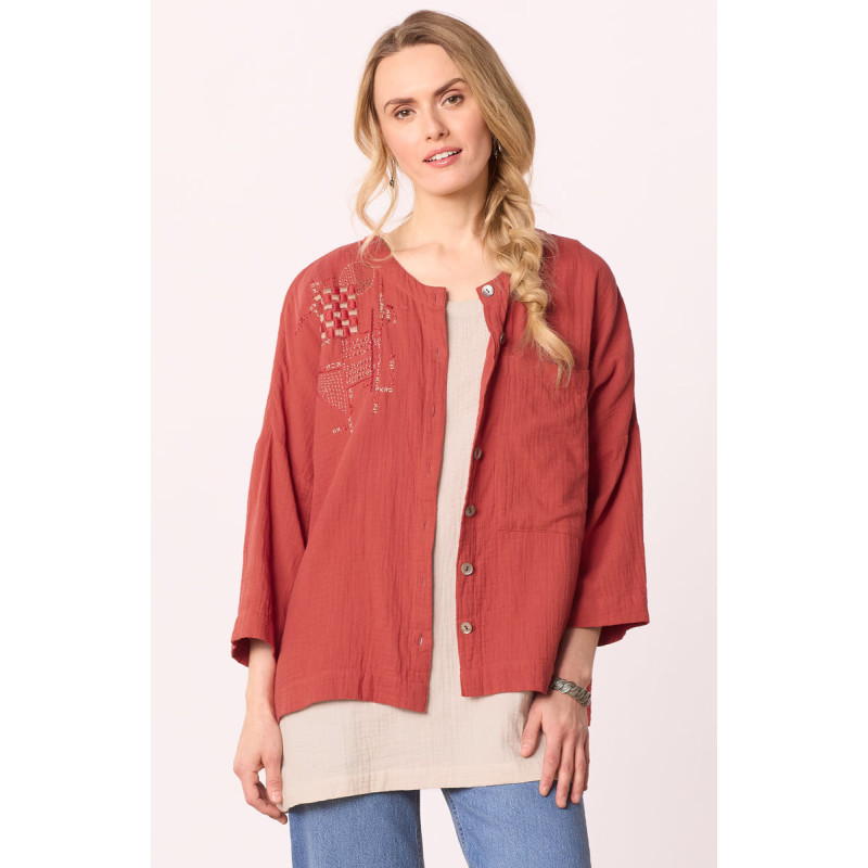 Deceptively simple button-front jacket in red double gauze works as a top or a jacket. Intricate dimensional hand embroidery makes this soft shirt-jacket special. Dropped shoulders and three-quarter length sleeves. Generously cut - consider sizing down for a less oversized look.