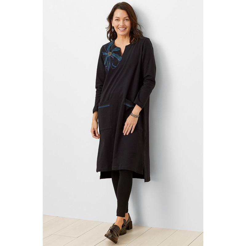 Dynamic dimensional embroidery is the focal point of this mid-weight organic French terry knit pullover dress. Style and comfort, the perfect pair! Notch-neck and high-low hem with side slits.
