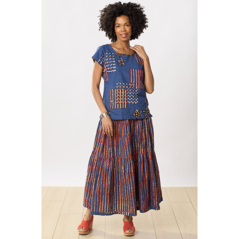 This three-tiered A-line long skirt in a batik printed stripe of rich blue, dark gold, and spicy red will make you want to twirl! Blockprinted contrast hem, with hand embroidery accents on the seam detail of each tier. Elastic waist has a drawstring to adjust to your preferred fit.