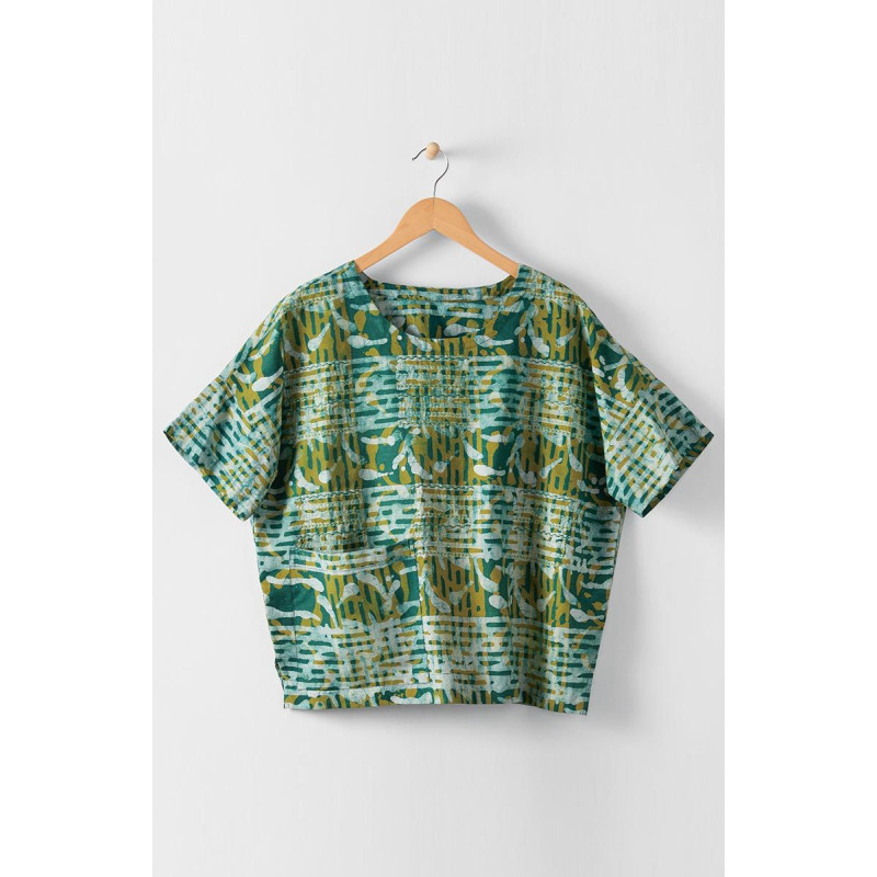 Easy-fitting top in batik printed shades of green herbal tea and teal blue. Dropped shoulders and short sleeves. Side slits. Hand embroidery embellishments. Generously sized.