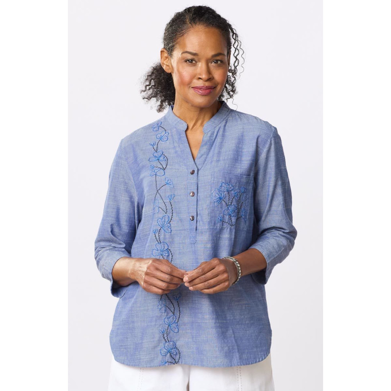 The chambray fabric in this band collar shirt is woven with a blue warp yarn and a white filling yarn, creating a classic look for this easy style finished with the distinctive MarketPlace hand embroidery. Shirttail hem, side slits. Three-quarter length sleeves.
