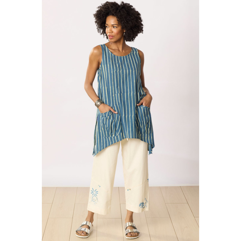 Straight-leg creamy-white cotton twill pants have diagonal seam leg detail and bright hand embroidery. Elastic waist has a drawstring to adjust to your preferred fit.